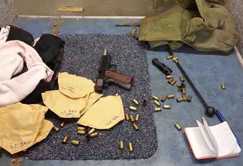 27 november 2013. Verder testen met de 1911 Vandaag worden alle kogels verschoten die Hildo nog heeft. Een serie van de 230 grain volmantels, een serie van de 185 grain geharde kogels en een serie van zijn eigen gegoten RCBS 452-185 semi wadcutter kogels van lood met 4% tin. Overal gaat 3,2 grain Vectan BA10 achter, want dat schiet erg rustig. Klemmers! U ziet het boven, twee maal een weigering tijdens het laden, beide keren met de semi wadcutters van RCBS. Jammer want de kogel ponst verder mooie ronde gaten in het papier en lijkt zeer zuiver te schieten. Ook met deze lage lading komt er loodafzetting in de loop. Dat kogels van lood met 4% tin niet goed te verschieten zijn met nitrokruit is duidelijk. Zowel de 230 volmantel als de 452-185 geharde rondneus kogels gaan allemaal de loop uit zonder problemen of weigeringen.