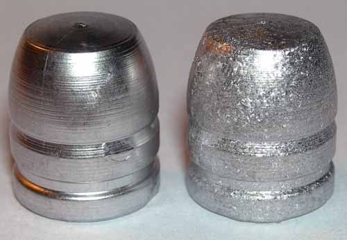 10) Testresultaat Hildo heeft gelijk maar twee kogels dezelfde test laten ondergaan om wat verschillen te kunnen zien. Op de bovenste foto is de kogel links een standaard full metal jacket exemplaar, die voor aanvang van de test een diameter van .450" had. De kogel rechts is dus de LEE 452-200-RF, met een diameter van 4525" voor aanvang van de test. Op de onderste foto ziet u de 452-185 RCBS semi wadcutter, die voor aanvang van de test een diameter van 451" had. Zwarte aanslag Het slaghoedje, een CCI 300 large pistol, verbrandt niet echt schoon. Er komt nogal wat zwarte roetachtige smurrie vrij en dat is in deze situatie natuurlijk hartstikke mooi want dat laat de resultaten van erlangs geblazen gassen beter zien. De volmantel U kunt duidelijk zien dat de druk van het slaghoedje bij de kogel langs is gegaan. De kogel heeft dezelfde maat als de loop, is in ieder geval niet oversize, wellicht om de drukken niet te hoog op te laten lopen in het wapen. Gascutting is echter niet aan de orde vanwege de koperen mantel die het lood beschermt. Daarnaast is het lood van de kogel vrij zacht. Hildo meet een hardheid van zo'n 8 Brinell aan de bodem van de kogel en die zachtheid zorgt er misschien voor dat de kogel tijdens het schot zich nog wat beter in de trekken zet. De gegoten LEE 452-200-RF De 19 Brinell harde kogel vult de trekken uitstekend. De velden geven lange afdrukken op de kogel en daarmee prima grip. Duidelijk te zien op de contactvlakken is het ontbreken van de Liquid Alox. De kogel zou op deze manier, zonder smering, de rest van de loop doorgegaan zijn. Hoe zou de Liquid Alox dan nog wat kunnen smeren? Hildo weet het niet, want een voorraadje vet wat normaliter in de vetgroeven zit en over de volledige lengte van de loop dient te worden afgegeven, is niet aanwezig. Er is overigens, zoals u kunt zien, vrijwel geen zwarte aanslag door de ontbrandingsgassen van het slaghoedje. De loop wordt volledig afgedicht door de kogel. De gegoten RCBS 450-185 SWC In de praktijk geeft deze kogel ernstige loodafzettingen in de loop. Voor de test is dit specifieke exemplaar met een diameter van 451" vreemd omdat ze normaal gesproken toch een stuk groter uit de mal vallen. Iets van 454" meent Hildo. In ieder geval, na de reis door de loop is de kogel nog 450". De bodem van de kogel is roetzwart, maar er is niet veel percussiekapjeverontreiniging bij de kogel langsgegaan. Echt vreselijk gevoelig voor gascutting lijkt deze kogel niet, maar de LEE 452-200 kogel doet het beter. De grote diepe vetgroeven bieden genoeg ruimte voor vet, maar de smalle driving bands bieden weinig contactvlak en lijken daarmee de achilleshiel te zijn van deze kogel, tenminste als u met relatief zacht lood schiet. Kogeldiameters na de test De volmantel is nog steeds .450". De gegoten LEE 452-200 is duidelijk kleiner geworden: van 4525" naar.4505". De gegoten RCBS 450-185 is ook kleiner geworden: van .451 naar .450". Gasdrukken De volmantelkogel komt een fractie verder in de loop dan de gegoten LEE kogel. Puur door weerstand in de loop zou de volmantel wat minder hoge piekdrukken moeten generen dan de gegoten kogel, maar de gegoten kogel is weer lichter en komt weer wat gemakkelijker uit de huls. Misschien maakt het in de praktijk niet veel uit. De RCBS is licht, heeft de minste weerstand en blijft nog nét in de loopmonding zitten. De RCBS kan daardoor ongetwijfeld het meeste kruit aan zonder dat de piekdruk te hoog oploopt maar de kogel zelf wordt gestript. Diameter trekken & velden De Norinco heeft zes trekken en zes velden en dat is gemakkelijk meten omdat ze precies tegenover elkaar liggen, dat is met oneven getal, als vijf of zeven trekken en velden even lastiger. Als Hildo de 'afgeschoten' kogels opmeet, komen de velden op .442" en de trekken zijn .450". Dit geeft een diepte van 450 - 442 = .008 : 2 = .004" diepe trekken. Het opmeten van de loopmonding geeft precies hetzelfde resultaat. Conclusie Hildo denkt dat de kogeldiameter groter moet zijn dan de trekken, net zoals bij zwartkruitwapens. Een massieve kogel gebruiken die gelijk is aan of zelfs kleiner is dan de diameter van de trekken en ervan uitgaan dat de kogel wel zal opstuiken tot het juiste formaat, lijkt geen goed uitgangspunt. Zeker niet met een relatief lichte kogel, hard lood en een lichte kruitlading, dat is vragen om gascutting. De kogel uit de Lee 452-200-RF gietmal lijkt Hildo de beste kogel om met zacht lood te kunnen schieten. Dit omdat een groot deel van het oppervlak van de kogel in de trekken geduwd wordt. Het lijkt er niet op dat de kogels smelten, het probleem zit hem in de te grote zachtheid van het lood waardoor een kogel de trekken in de loop niet kan volgen, met het strippen van de kogel, en daarmee loodafzetting, tot gevolg. Dat de RCBS kogel, met het veel kleinere oppervlak in de trekken, harder lood nodig heeft dan de LEE kogel lijkt overduidelijk. Hoe hard het lood precies moet zijn weet Hildo nog niet, kwestie van proefondervindelijk schieten. Wel iets om rekening mee te houden is, dat hoe harder het lood is hoe hoger de piekdrukken in het wapen oplopen. Iets waar een herlaadtabel geen rekening mee houdt. Na het schot het slaghoedje bekijken op eventuele overdrukverschijnselen lijkt Hildo daarom verstandig maar of het zinvol is? De 45 ACP patroon werkt op relatief lage drukken, vervorming van het slaghoedje vindt pas plaatst bij veel hogere drukken, veel hoger dan die voor de 45 ACP toelaatbaar zijn.