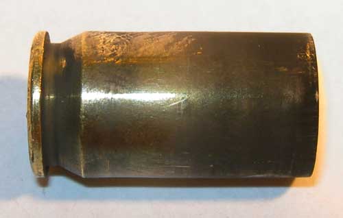 11) Kruitloze huls... hij is zwart! Dit is één van de hulzen die Hildo gebruikt heeft om te schieten zonder kruit. Wat opvalt is de hoeveelheid 'roet', want schoon schieten doet een slaghoedje niet. De oorzaak is eenvoudig: De kamer is een fractie groter dan de huls, zou dat niet zo zijn dan krijgt u de patroon de kamer niet in. Op het moment dat het slaghoedje afgaat loopt de druk nauwelijks op, vandaar dat de roet tussen kamer en huls geperst wordt. Mét kruit dan? Dan wordt het een beetje anders. Door de aanwezigheid van kruit achter de kogel loopt de druk natuurlijk veel hoger op en de huls zet uit totdat hij de wand van de kamer tegenkomt. Omdat de hulswand met kracht tegen de kamerwand gedrukt wordt, kan er geen roet tussen huls en kamerwand komen. Met weinig kruit Als u met gereduceerde ladingen schiet, dan is de kans groot dat u toch in meer of mindere mate een zwarte afzetting krijgt. Gooit u een beetje meer kruit in de huls, dan zal dat effect verminderen of zelfs verdwijnen. Wel blijven opletten wat u doet natuurlijk. De afzetting is een indicatie van weinig kruit, maar u dient altijd de data van de herlaadtabel in acht te nemen.