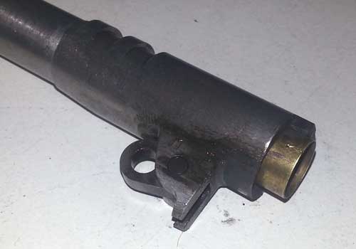 6) Vanuit de loopmonding Duidelijk te zien, de gegoten kogel zit shocking klem in de loop.