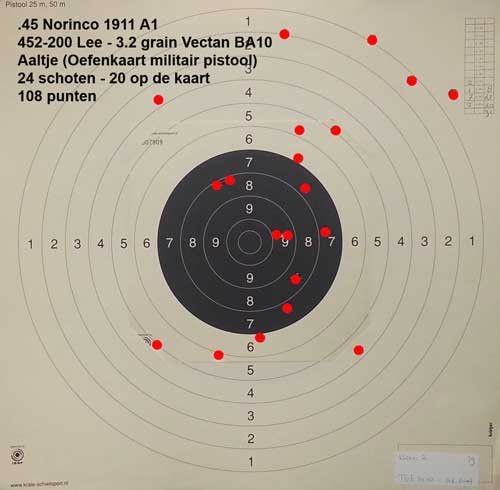 5 maart 2014. Topgroep met de Norinco! Van Michael, een voormalige collega-schutter van SV Cassidy, een flinke serie kogels gekregen. Deze kogels zijn de gegoten uitvoering uit de 452-228 1R giettang van Lee, van de standaard volmantel 230 grain kogel, de zogenaamde 'hardball' met ronde neus. Dát is de kogel waarvoor de 1911 destijds is ontworpen en over het algemeen zijn dat ook de kogels waarmee een 1911 probleemloos functioneert. Lee 452-228 in de praktijk Ondanks het hogere gewicht van deze kogel is er eigenlijk nauwelijks iets te merken van meer terugslag, in ieder geval niet met deze rustige 3,2 grain BA10 kruitlading: het schiet best vriendelijk. Na geschoten te hebben met de Walker, rost Hildo er met de 1911 nog een serie van 28 patronen door. Het schiet prima en het wapen, dat normaal toch sterk de neiging vertoont tot vastlopen tijdens de patroonaanvoer, schiet deze 28 er probleemloos door. Groot is Hildo's verbazing als hij de kaart terughaalt. Een echt kleine groep die er niet om liegt. Dit geeft de burger weer moed! De kaart laat zien dat de precisie van deze low budget Norinco helemaal niets onderdoet voor veel duurdere 1911 modellen. Als de goeie kogels er maar inzitten!