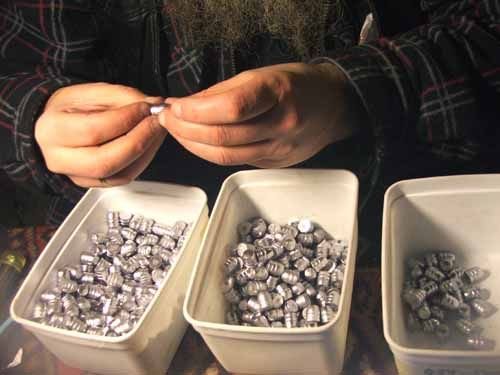 2 februari 2014. Kogelcheck Twee uur gieten uit twee volle gietovens levert met de zesvoudige giettang een verbluffende hoeveelheid kogels op. Hildo heeft ze niet geteld, maar u ziet ze hier allemaal liggen. Helaas zijn niet alle kogels even geweldig geworden. Soms zijn ze niet goed gevuld, soms een beetje rimpelig, vooral die in het begin gegoten zijn. Dus elke kogel wordt gecheckt. De schietsport is soms een tijdverslindende hobby waarbij u alle kans krijgt volledig tot rust te komen. Bakje links zijn de nog te checken kogels, bakje in het midden zijn goedgekeurd en bakje rechts afgekeurd. Pinda's van Duyvis zijn altijd Oké, Hildo kogels zijn dat niet. Oké?
