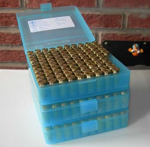 28 februari 2014. 45 ACP munitiedozen Dit is het betere werk. Weg met die kogelsokken! Er zit vrijwel geen loze ruimte in deze dozen, dus maximale efficiëntie is gewaarborgd. Stapelbaar zijn ze ook. Ze passen daarmee erg goed in de kluis. Verschillende ladingen zijn prima te noteren en bij te houden. Zelfs verschillende soorten hulzen zijn te sorteren, mocht u dat willen. Voor vijf euro per goed sluitende en doorzichtige doos kunt u 100 patronen kwijt en dat, meent Hildo, maakt dit een goede koop.