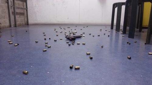 1 maart 2014. De trekker wordt er haast warm van! Geen andere schutters op de baan, dat scheelt. Kan hij de hulzen laten liggen zonder de kans op een hele serie platgewandelde exemplaren. De 1911 gooit ze nogal een stukje van het schietpunt vandaan, alle kanten op eigenlijk. De kaart is Hildo vergeten te fotograferen, geeft niet. Zat vol gaten, dat snapt u. Het gaat hier om gewenning aan het wapen. Hildo hoopt dat de resultaten door de routine omhoog zullen gaan. Hij doet zijn best. Straks weer herladen. Als hij ten strijde trekt in de discipline 'militair pistool' en verliest, zal het niet gelegen hebben aan te weinig schieten!