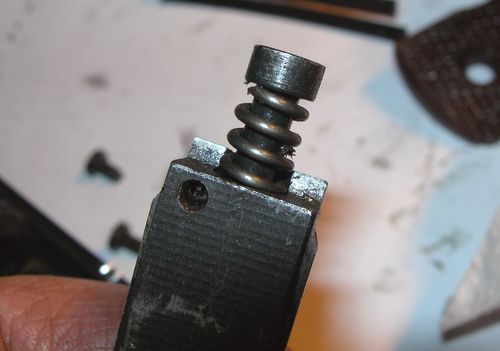 C) 21 april 2014. Trekker Tjoenen poging 2 De hoofdveer zit in het onderste gedeelte van de greep, aan de achterkant. Die uítstekende ijzeren klomp met die ribbeltjes erop. Hildo wist niet eens dat daar nog een veer binnenin zat. Ha... niet verder vertellen hoor. Zowel op de onder- als bovenkant komt een kap. De montage van de hoofdveer is een kwestie van induwen en een kleine paspen terug in de hoofdveerbehuizing duwen zodat de veer er niet meer uitspringen kan. Resultaat? De haan is gemakkelijker te spannen en de trekkerdruk is lager. Het is nog geen wedstrijdpistool, maar in ieder geval is het beter. Hildo vuurt twee lege hulzen met een nieuwe primer af om te zien of de hamer nog genoeg kracht heeft, ze gaan beide prima af en de deuk in de primer is duidelijk en diep. Goedgekeurd.