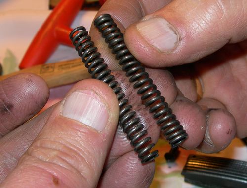 8 januari 2014. 1911 slide spring Een sluitveer, terugstootveer, sledeveer: als het beestje maar een naam heeft. Het is de veer die de slede opvangt na het schot en weer naar voren duwt zodat een nieuwe patroon in de kamer geladen wordt. Met licht geladen munitie heeft u een andere veerdruk nodig dan met pittig geladen patronen. Deze kreeg Hildo van een collegaschutter om te proberen. De veer blijkt veel sterker dan die er nu in zit en maakt het wapen lastig te spannen. Hildo denkt niet dat deze veer nodig is met zijn superlicht geladen munitie en geeft de veer daarom, ongebruikt, terug.