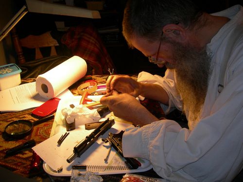23 februari 2013. Trekker Tjoenen in Grunn op toafel... mienjong. De trekkerdruk van de 1911 is iets van 2,5 kilo, dus hier kan wat aan worden verbeterd. Iets van 1,5 kilo valt binnen de wedstrijdnorm en dat zou het schieten stukken veraangenamen en de resultaten ongetwijfeld verbeteren. Hildo heeft het pistool voor de eerste keer helemaal uit elkaar gehaald. Hoe moeilijk kan het zijn? Even wat instructievideootjes op Youtube bekijken van gekke Amerikanen die er mee aan het rommelen zijn en hij krijgt al snel een indruk van hoe en waarom het gaat. Het uit elkaar halen is, zelfs voor iemand die niet erg handig is, goed te doen. Speciaal gereedschap Natuurlijk heeft u voor het tunen van de trekker speciaal gereedschap nodig, te verkrijgen via Brownells. Dat is een Amerikaanse wapenhandel die onder meer een hele sortering gereedschap op de markt brengt die de wapenhersteller nodig heeft om dit soort werk naar behoren te kunnen doen. Voor waarschijnlijk iets van 200 dollar koopt u de noodzakelijke gereedschappen, maar daar komen nog verzendkosten, inklaringskosten en BTW over heen. De laatste keer dat Hildo wat uit Amerika bestelde, wat gietblokken, viel het behoorlijk tegen. Die 200 Amerikaanse dollars kunnen zo maar 300 Europese euro's worden, schat hij. Dat staat in geen enkele verhouding tot het pistool zelf dat goedkoper was. Een beetje eenmalig slijpen en polijsten, is alles wat er moet gebeuren en dan is de investering gewoon te hoog. Geen wonder dat schutters voor dit klusje hun wapens wegbrengen. Maar laten zitten dan? Welnee zeg. Gewoon proberen. Risico is er niet, u weet Hildo is altijd veilig bezig en dat gaat niet in het gedrang komen. Honder procent veiligheid is waar Hildo voor gaat. Als het mis gaat, dan betekent dat alleen dat hij nieuwe onderdelen moet kopen. In ieder geval is het leerproces in volle gang en het is erg interessant, dat is mechanische techniek altijd. Het meer dan honderd jaar oude design van deze 1911 laat Hildo een staaltje doordachte techniek zien en het is ronduit verbazingwekkend dat de hele toestand nog gewoon werkt ook.