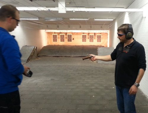 En? Hoe schiet die 1911? 'Mwooahhh.. gaat wel', aldus Hildo, 'Het is natuurlijk geen zwartkruit, dat schiet stukken mooier'. Het nitrokruit verbrandt sneller, is toch altijd feller, wat bijterig, hoewel een 9 mm erger is. Zwartkruit daarentegen is lekker rustig en geeft eerder een snelle duw dan een tik. De knal is net zo als het wapen schiet, 'Peng', tegenover de dreunende 'Boeeemmm' van zwartkruit. 'Het is gewoon even wennen hoor', aldus Hildo.