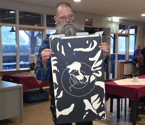 25 januari 2014. 'Oefenkaart' Militair Pistool Dit is niet de echte kaart waarop de discipline 'Militair Pistool' verschoten wordt, maar dat maakt even niet uit. Gewoon even proeven aan de discipline. Fearless Aaltje, ook zwartkruitschutter, wil ook wel even meedoen. Da's leuk. Hildo heeft natuurlijk het voordeel dat hij al meer met het pistool geschoten heeft en dit is veel meer een dynamische discipline dan het percussie voorlaadpistool waarmee Fearless schiet. De discipline 'Militair Pistool' 6 schoten op 25 meter, binnen 3 minuten, op 1 kaart 6 schoten op 20 meter, binnen 15 seconden, op 1 kaart 6 schoten op 20 meter, geknield, binnen 12 seconden, op 2 kaarten 6 schoten op 15 meter, binnen 9 seconden, op 3 kaarten Totaal 4 x 6 = 24 schoten Maximaal haalbare score 24 x in de 10 = 240 punten Schiet u buiten de tijd, dan wordt de hoogste score u ontnomen. Niet de officiële discipline regels Natuurlijk is dit een zeer korte samenvatting van de officiële regels, maar het geeft u een idee waarom het gaat. De officiële kaart ziet er anders uit en ook is vandaag maar op één kaart geschoten terwijl er tijdens de échte discipline op meerdere kaarten geschoten wordt. Het gaat om het idee en Hildo heeft gewonnen! Ha!