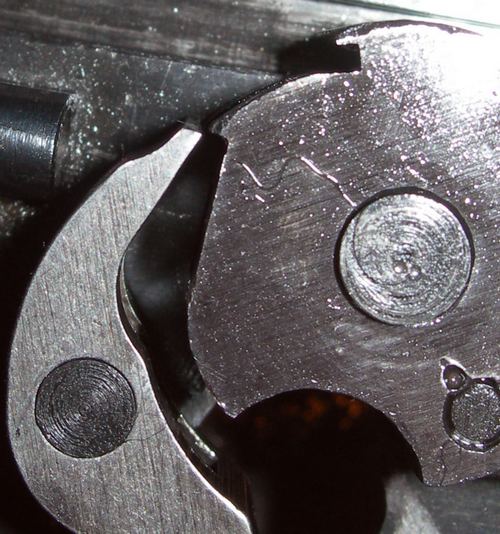 Voor een groot gedeelte is dit waar het om gaat. De tuimelaar ('sear') is het ding links en de haan ziet u rechts. Als u de trekker overhaalt, haakt de tuimelaar achter zijn inkeping weg en gaat het schot af. Als u een van beide of beide onderdelen een foute hoek geeft ten opzichte van elkaar, krijgt u niet het resultaat dat u wenst. Beide onderdelen dienen zo glad mogelijk gepolijst te zijn, zodat de trekker overhalen mooi gladjes verloopt. Dit is tricky hoor. Geen handleiding Hildo gaat er verder niet op in wat hij verandert, want dit is geen instructiehandleiding om een trekker van een 1911 te tunen. Wat hij allemaal doet is mogelijk, en zelfs waarschijnlijk, hartstikke fout en oliedom. Alst hij straks nieuwe onderdelen moet kopen heeft hij het in ieder geval geprobeerd! Hildo wil u niet opzadelen met de aanschaf van nieuwe onderdelen omdat u in een vlaag van verstandsverbijstering veronderstelt dat Hildo weet waar hij mee bezig is. Zo wordt u de aanschaf van nieuwe onderdelen voor uw hopeloos verknoeide trekkergroep in ieder geval bespaart. Hij denkt met u mee hoor!