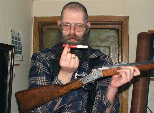 Past niet! Snik, snotter. Hildo kijkt nu tamelijk beteuterd. Was hem nog verteld 'de kogel duw je er zo met je duim in, je hebt helemaal geen herlaadapparatuur nodig', blijkt niet waar met deze kogel. De binnendiameter van de huls is precies .50 inch en de kogel zit niet ver af van de .515 inch die hij zou moeten zijn. U snapt, net zoals Hildo zelf, ook wel dat die dikke kogel nooit zo in die huls past. Misschien als de huls afgeschoten geweest is, dat ie een beetje ruimer wordt, maar Hildo denkt niet dat het zoveel zal schelen. Veel van de kogel afhalen, moet ook weer niet anders zit de kogel straks niet lekker strak in de loop en een 50-70 kogel hoort wel .515 te zijn want die maat klopt ook wel met zijn loop. Dat heeft ie zelf, door een chocolade paaseitje door de loop te drukken, nog uitgevonden zoals u zich mogelijk zal kunnen herinneren. Allemaal wel een beetje vreemd hoor, aldus een gedeprimeerde Hildo.