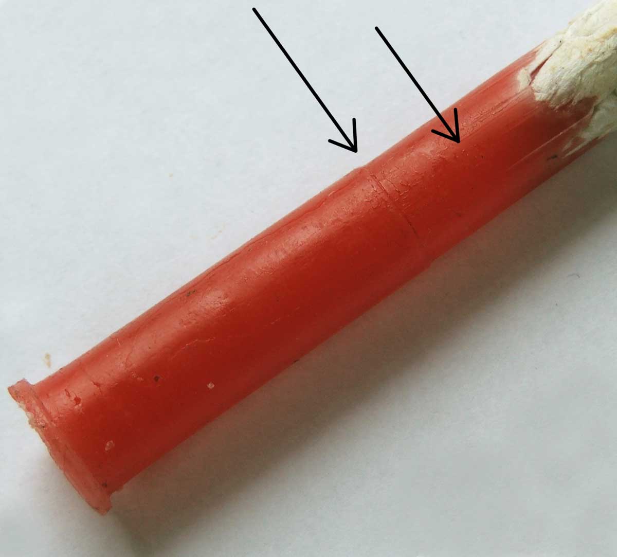 8) De kaarsvet afdruk van de kamer. (klik foto groter) De linker pijl geeft het uiteinde van de huls nek aan. De rechter pijl het allereerst zichtbare begin van de trekken en velden. Na het opmeten van de maten van de kamer lijkt het Hildo dat het hier een 50-70 huls betreft. De maten kloppen voor zover Hildo het heeft kunnen meten. Van een collega schutter krijgt Hildo binnenkort een losse lege 50-70 huls en een losse kogel te leen. Daarmee kan Hildo exact de headspace bepalen daarmee wat voor munitie hij voor Meester Hansson op zijn verlof moet laten bijschrijven.