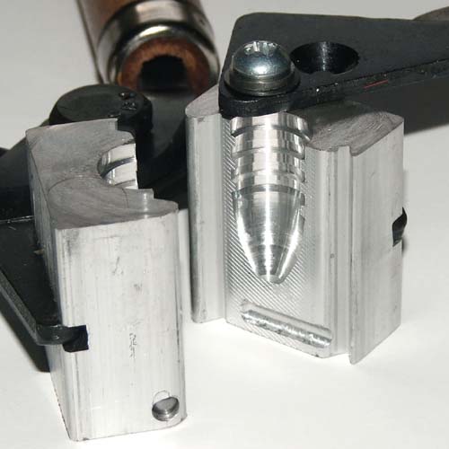 De .500-360 Minie kogel Deze komt er goed aan de maat uit, ondanks dat ze er niet 100% perfect uitzien. Ze zijn prima in de huls te krijgen zonder gebruik van herlaad apparatuur. In een gebruikte huls die opgerekt is naar .509" zitten ze zelfs behoorlijk ruim, maar met een beetje vet ertussen blijven ze wel plakken meent Hildo. De tang giet lekker, Hildo heeft nu een stuks of 70 kogels gegoten om te proberen. Met name is de kogel makkelijk uit de tang te krijgen tijdens het gieten. U doet de mal open en hij valt er welhaast vanzelf uit. Prima.