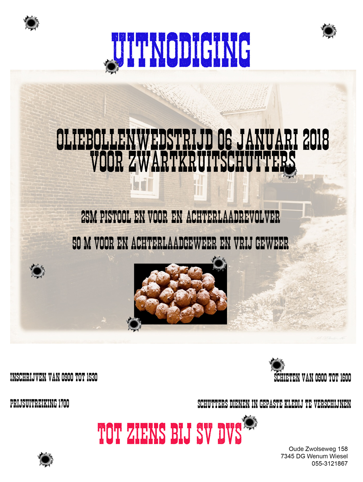 6 jan. 2018 - Oliebollenwedstrijd (Wenum-Wiesel) Voorheen werd de fameuze oliebollenwedstrijd georganiseerd door SV De Vrijheid in Hoogeveen, maar de organisatie is nu in handen van DVS (De Veluwse Schutters). Derhalve is het vanaf 9.00h t/m 16.00h knallen en oliebollen eten tot u ploft op het terrein van Weasel Creek. Adres: Oude Zwolseweg 158, 7345 DG Wenum-Wiesel (Bij Apeldoorn). Website De Veluwse Schutters