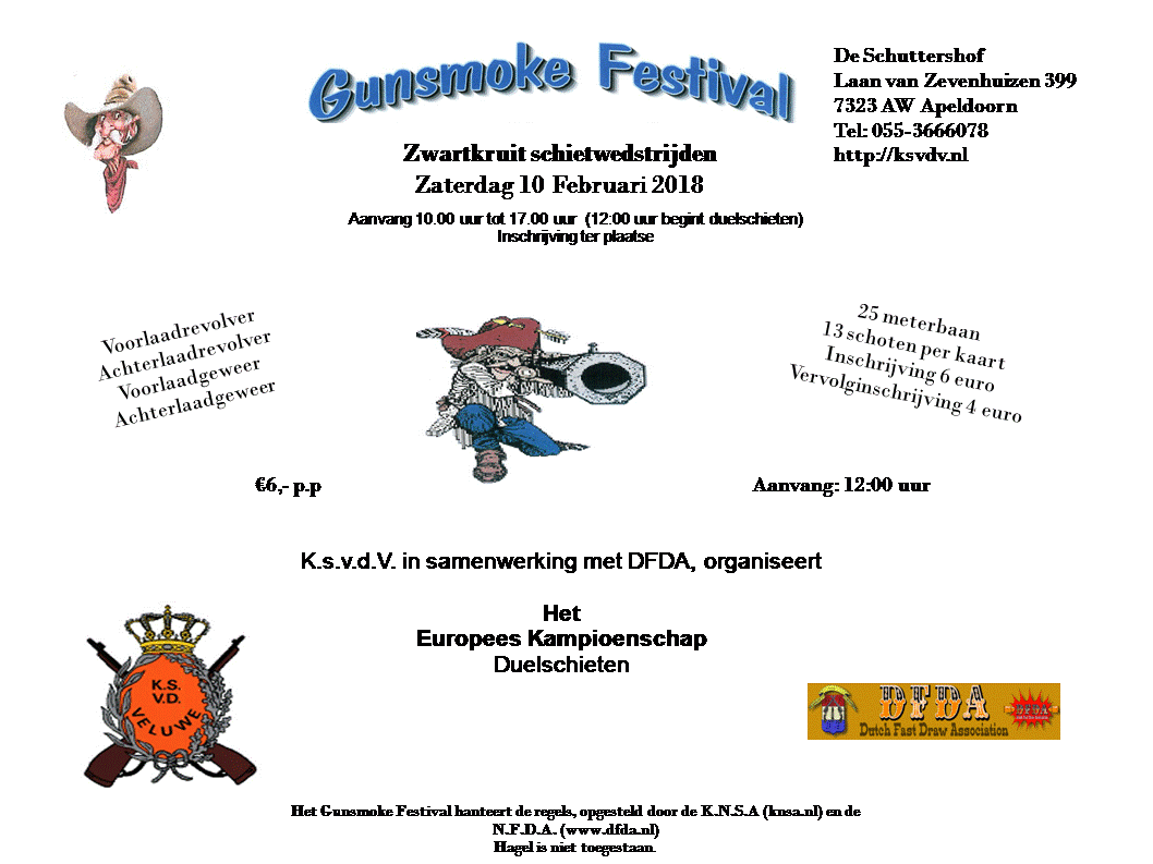 10 feb. 2018 - Gunsmoke festival (Apeldoorn) Het jaarlijkse Gunsmoke festival, georganiseerd door de Koninklijke Scherpschutters Van De Veluwe. Op het program staan voor- en achterlaad revolver en voor- en achterlaadgeweer. Alles op de 25 meter. Ook het Europees Kampioenschap duel, georganiseerd door de DFDA, zal worden verschoten. Bent u van mening dat ú de snelste duelschutter van Europa bent, dan is het nú het moment om dat te laten zien! Adres: De Schuttershof, Laan van Zevenhuizen 399, Apeldoorn.