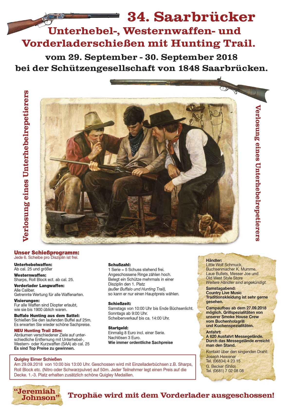 29 sept. - 30 sept. 2018 - Westerntreffen Schützengesellschaft 1848 Saarbrücken Een rit naar Saarbrücken is aan te raden voor wie een westernweekend bij onze oosterburen wel ziet zitten. Deze vereniging zag het levenslicht in 1848, dus aan ervaring om een leuk westernweekend te organiseren zal het hen niet ontbreken. Op het programma staan allerhande disciplines die u als zwartkruitschutter kunnen aanspreken. Adres: