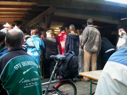Drukte bij de eetgelegenheid Aan de rechterkant van het clubhuis is de keuken te vinden. Het viel Hildo op dat op zaterdag, aan het eind van de middag, steeds meer mensen opdoken. Geen zwartkruitschutters, maar mogelijk gewone passanten en/of geïnteresseerden. Als die allemaal ook wat willen eten en drinken dan wordt het wel erg druk. Maar de prijzen van de maaltijden lagen dan ook bijzonder laag. Klein glas cola 50 cent, groot glas bier 2 euro, portie zelfgemaakte Kartoffelsalad of patat 1 euro, een groot stuk vlees 1.50 euro. Ook prijstechnisch lijkt het zwartkruit tijdperk welhaast weer terug te zijn. Uitstekend bikken dus, voor weinig.