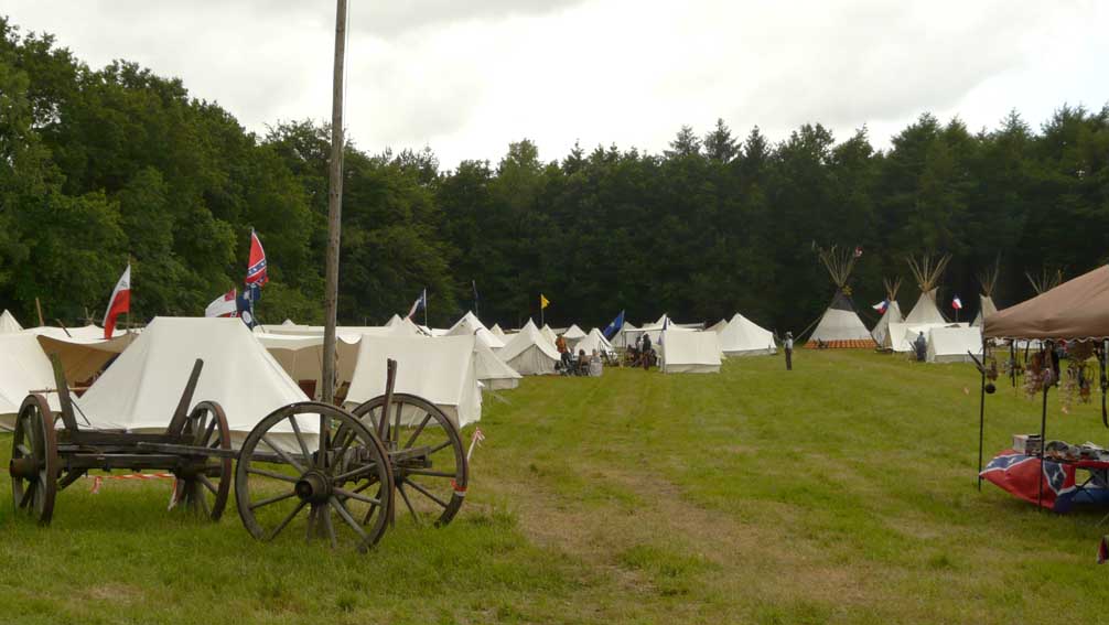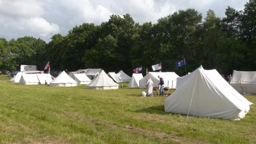 Authentieke tenten Het behoorlijk grote kampeerterrein, op de overzichtsfoto bovenaan ziet u nog niet de helft, is aan de ene kant gereserveerd voor authentieke tenten. Een behoorlijk aantal van de deelnemers komt, behalve in passende kledij, met periode correct kampeermateriaal. En niet alleen de tenten, maar ook andere kampeer accessoires zijn periode correct. Erg leuk om te zien dat lang niet alle deelnemers er alleen maar zijn om te schieten