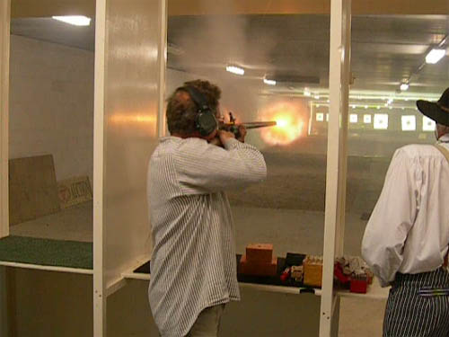 Hildo's instructeur en Aaltje kijkend naar Hildo's eerste verrichtingen als instructeur van Meneer T. terwijl die met Hildo's musket schiet. Niemand mag zo maar zijn wapen afgeven aan een ander om er mee te gaan schieten. De eigenaar van het wapen dient er ten alle tijde bij aanwezig te zijn. Zo staat het in de wet en ook Hildo houdt zich er stipt aan. Ook al loopt iedereen er een beetje onnozel bij... een westernweekend is zeker geen wild west en wat veiligheid betreft wordt er niets aan het toeval overgelaten.