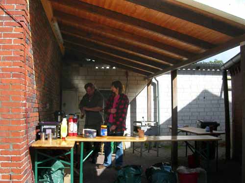 Semi-buiten duelschieten Hier ziet u de uitbouw van de schietbaan. Bijzonder smaakvol en heel handig als het weer niet helemaal meewerkt, zoals deze dag het geval is. De duel-installatie is aan het eind opgebouwd. Aan het andere eind bevinden zich de bruine bonen en broodjes hamburger.