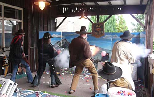 1) NK Duel 2009 Hier mag Hildo zijn snelschietkunsten meten met de andere duelschutters. Vier schutters tegelijk voor de ballonnen betekent dat er twee duels tegelijkertijd worden uitgevochten. Hildo schiet tegen de man links van hem, de twee aan de rechterkant hebben hun eigen duel. De twee rechter schutters schoten het snelst, u ziet het aan de rookwolken. Daarna kwam Hildo's tegenstander, u ziet het vuur uit zijn revolver. En Hildo? Hildo was aan het dagdromen of zo, want hij is nog steeds bezig om zijn revolver uit zijn holster te trekken. Een razendsnelle schutter lijkt hij niet te zijn.