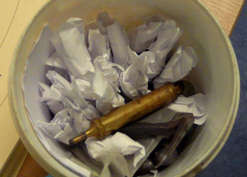 Munitie voorraad Hildo dacht handig te zijn en de kogels thuis al in het printerpapier te wikkelen zodat ze zo de loop in kunnen. Sneller laden. Maar dan moet het papier niet klem komen te zitten tussen kogel en loop tijdens het laden want dan wordt het lastig. Met enig genuanceerd tikwerk lukt het alsnog om de kogels beneden te krijgen. Volgende keer in ieder geval minder papier om de kogel.