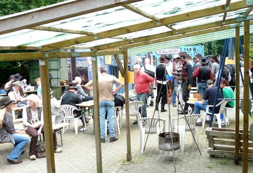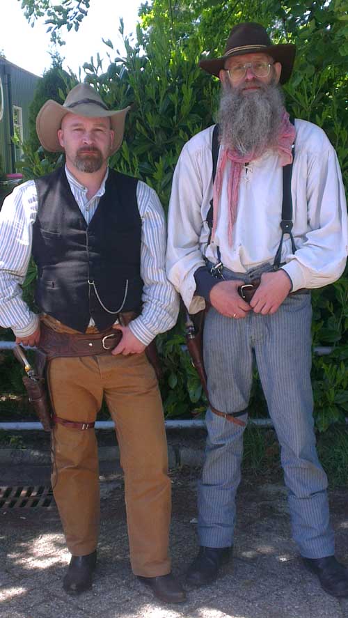 Stroomstoring Helaas valt gedurende het weekend meerdere malen de stroom uit, iets wat nooit het geval is op de banen van De Vrijheid. Na afloop blijkt dat dit door de patatbakker is veroorzaakt. Hij heeft ergens een storing zitten die bij andere evenementen waar hij was ook al voor stroomuitval heeft gezorgd. De volgende keer krijgt hij in ieder geval een stroomvoorziening die niet is aangesloten op de verlichting en afzuiging van de schietbanen. Gelukkig is er met het eten van deze rijdende snackbar niets mis, zijn gehaktballen zijn zelfs uitermate! More Western Style? Leuker zou het natuurlijk zijn om alles in eigen beheer, in old-western style, te regelen. Maar de catering is uitbesteed omdat het te veel werk is. Zolang het westernweekend gerund word door vrijwillgers is man/vrouwkracht niet onbeperkt aanwezig en dat is simpelweg waar de schoen wringt, iets waar alle westernweekeinden mee worstelen.