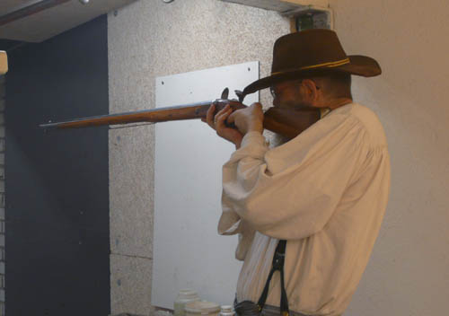 Erwin Dahlkamp met een vuursteengeweer Hij schiet op de correcte kaart. Dezelfde 55x55 cm pistoolkaart, net zoals waar alle percussie geweerschutters op schieten. Dat een 85x85 cm miquelet kaart toch écht alleen bedoeld is voor steenslot gladloops musketten en niet voor een geweer met trekken en velden, daar wil SV de Vrijheid tot op heden nog steeds niet aan want 'vuursteen is vuursteen'. Erg jammer want dit stimuleert miqueletschutters niet en het is al moeilijk genoeg om een redelijke hoeveelheid schutters van deze, overigens erg leuke, discipline bij elkaar te krijgen. Het is niet de eerste keer dat Hildo anderen met Lucy, zijn musket, laat schieten om tot een groter deelnemersveld te komen.