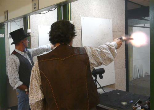 Op de baan met concentratieproblemen 'Niet praten op de baan', aldus de pistoolschutter. 'Dat verstoort de concentratie, ik kom hier om te winnen'. Hildo vindt dit onzin want dit is een westernweekend, zeker geen KNSA-wedstrijd . Gekeuvel en gezelligheid in een ontspannen sfeer hoort er, wat Hildo betreft, ook op de schietbaan bij. Schudden in de klompen Maar de pistoolschutter krijgt het lastig want links staat een vrolijk grijnzende Hildo met de BFR en rechts Andere André met Lucy. 'Schiet maar even door, ik wacht wel. Ik sta te schudden in mijn klompen', zegt de pistoolman. Ondanks zijn klaarblijkelijke concentratieproblemen door een paar BFR-knallen en wat gepraat... de eerste prijs winnen doet hij uiteindelijk wèl met 97 punten. Kwaliteit verloochent zich niet! Wèl praten op de baan In Hoogeveen is Hildo baancommandant en hij belooft u nu alvast: 'Er mag daar, net als altijd, rustig wat gekeuveld worden hoor'. Gezelligheid en plezier zijn belangrijk, ook op het schietpunt. En... ook in Hoogeveen wint de beste schutter!