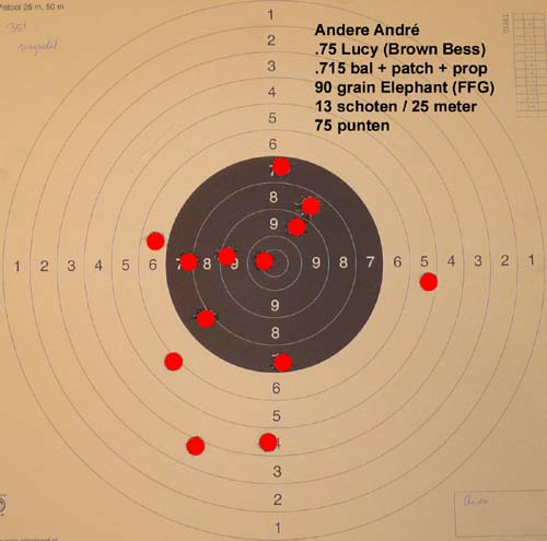 Andere André vs Hildo... Miquelet! Op het scherpst van de snede, zenuwen gespannen als het staaldraad van een hangbrug, zweet op het hoofd en priemende ogen om het juiste richtpunt in te schatten Miquelet op een gewone 55x55 cm pistoolkaart U weet dat een miqueletkaart 85x85 cm meet, een aangepaste grootte om het gebrek aan nauwkeurigheid te kunnen compenseren. Helaas zijn de miqueletkaarten zijn op. De oplossing is om op 25 meter op een gewone kaart te schieten. Dat lijkt aardig overeen te komen met een miqueletkaart op 50 meter. Het is wel jammer dat de Miquelets ditmaal zijn ingedeeld bij voorlaadgeweer, een aparte klasse zou toch leuker geweest zijn. Maar geeft niets, om het toch spannend te houden schieten zowel Andere André als Hildo met Lucy, Hildo's Brown Bess, een directe wedstrijd tegen elkaar. De betere schutter Hildo verliest altijd van Andere André, hij is zowel met revolver als het geweer de betere schutter. Maar André heeft zelf geen musket. Dat beperkt André's mogelijkheid tot oefenen. Dat is een voordeel voor Hildo, want Miquelet schieten is een lastige discipline. Een schutter die alleen maar geweer schiet, brengt het er met een steenslotmusket over het algemeen beroerd af. Hildo wint! Voor de historici onder ons: De eerste keer dat André schoot met een musket won Hildo met 75 vs. 61 punten. De vorige keer, juni 2012, verloor Hildo met 70 vs. 71 punten, net zoals dat hij alle andere competities met revolver en geweer van André heeft verloren. De 75 punten die Andere André deze middag schiet zijn zeker niet slecht, maar nèt niet goed genoeg. Hildo schiet met 76 net één puntje meer! De overwinning is nipt, maar zijn dag kan niet meer stuk! Valt het u misschien ook op...André's puntenaantal gaat bij iedere wedstrijd omhoog! Oei.