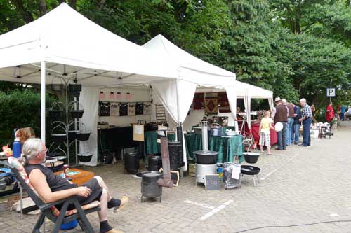 Stalletjes Altijd in overvloed aanwezig met allerlei handelswaar. Hier links houtkacheltjes en waarschijnlijk periodiek tamelijk correct kookgerei.