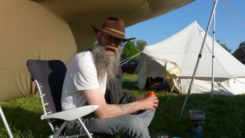 Onder de opgezette tarp 'Hee hallo, ook een bakkie koffie?' Hildo heeft het naar z'n zin. 'Prima zitten onder zo'n tarp zeg', meent hij. Geeft toch wat meer cachet aan het kamperen en als de zon aan de hemel staat te branden, is in een tent zitten niet aan te bevelen, maar onder een tarp is het prima uit te houden.
