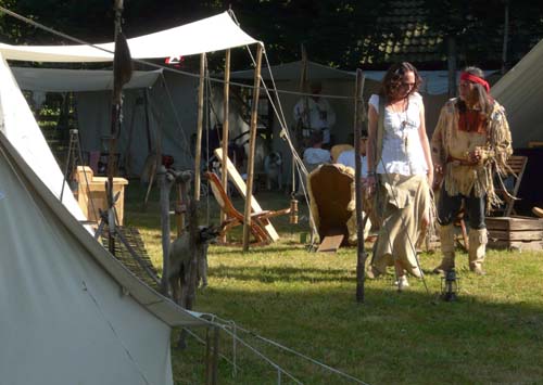 Trapperveld Deze diehard witte tentenliefhebbers staan op een apart terrein en de sfeer is er, eerlijk gezegd, tóch iets anders en leuker dan wanneer er overal caravans tussen staan. Het is wel een hele klus om een volledig periodiek correct kampement op te bouwen. Er is ook heel wat mee te slepen, want er past natuurlijk best veel in een huifkar. Een caravan is wat dat betreft wel heel gemakkelijk, zij het periodiek niet correct. Hildo doet het weliswaar met een witte tent, maar slaapt wel op een luchtbed, heeft prima zittende plastic klapstoeltjes en een bakkie koffie zetten doet ie gewoon met een gasbrandertje. Met de rest van de spulletjes is de auto dan al behoorlijk vol. En een aanhanger dan? Nee. Daar ligt voor hem de grens.