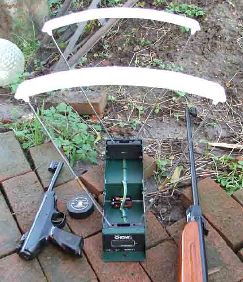 Chronograaf Het apparaat is een chronograaf, van het merk Shooting Chrony. Het wordt gebruikt om de snelheid van een vliegende kogel te meten door te berekenen hoe lang het duurt voordat de kogel de afstand tussen de twee lichtgevoelige sensoren heeft afgelegd, en het werkt. Waar dat goed voor is? Dat weet Hildo zelf ook nog niet helemaal, maar leuk is het alvast wel. Het is een van de meest eenvoudige uitvoeringen van een chronograaf, maar voor de 89 euro die het gekost heeft, vindt Hildo dit artikel best goed geprijsd. Het geheel is handig op te vouwen tot een klein groen doosje en daardoor makkelijk transporteerbaar. De lampen, die u er boven afgebeeld ziet, zijn optioneel te bestellen en te gebruiken voor binnenshuis gebruik. Zoals op een schietbaan bijvoorbeeld.