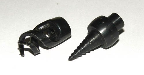 Kogel- & poetsdoektrekkers Mocht u onverhoopt uw musket of voorlaadgeweer geladen hebben om er vervolgens achter te komen dat u het kruit vergeten bent of dat de poetsdoek in de loop achtergebleven blijkt... dan zijn deze dingen handig. Gratis gekregen. Te monteren op een stevige poetsstok of een zelfgemaakte ijzeren staaf zodat u vervolgens de loden kogel of poetsdoek weer uit de loop kunt halen. Hildo's poetsstokken zijn hiervoor niet geschikt, dus hij moet er nog eens eentje maken. Update In de praktijk blijken deze dingen als kogeltrekker slecht te werken, vindt Hildo. Beter is het de kogel de loop uit te blazen met een beetje kruit achter de kogel via zundgat of percussiekapje. Met een compressor of een speciale 'ausblaser' gaat het ook prima, als u geen kruit achter de kogel kunt krijgen omdat de bal voor het zundgat zit... bijvoorbeeld..
