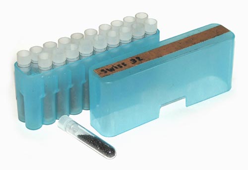 Kruitbuisjes Kleine plastic containertjes waarin een vooraf afgemeten hoeveelheid kruit gegoten wordt. Hildo heeft ze in de maten 50 en 75 grain, de 50 grain uitvoering ziet u afgebeeld. Op de schietbaan is het dan makkelijk om de goede hoeveelheid kruit in het wapen te gooien. U kunt bovenop de doosjes schrijven hoeveel en welke soort kruit er in zit, als u wat verschillende kruitsoorten of ladingen aan het testen bent. Ontploffingsgevaar is geminimaliseerd omdat de kruitvoorraad van elkaar gescheiden is. Uw schietijzer rechtstreeks laden vanuit een grote kruitcontainer, zoals een kruithoorn, is vanwege dit risico op veel banen verboden. Persoonlijk zou Hildo het sowieso wel uit zijn hoofd laten want een in de hand ontploffende kruithoorn, door een onverhoopt stukje nasmeulend residu, daar zit ook u niet op te wachten.