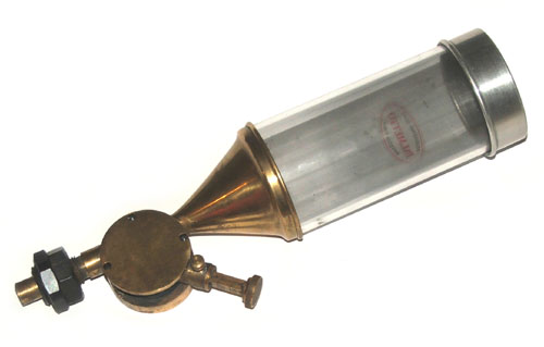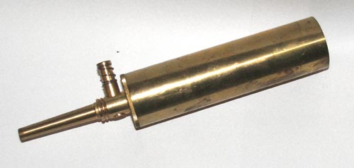 Kruithoorn Een moderne versie van een kruithoorn want Hildo is verteld dat de afsluiter van dit exemplaar helemaal top is, in tegenstelling tot sommige klassiek ogende exemplaren. Het apparaat is handig om op, bijvoorbeeld, een westernweekend uw kruitbuisjes te kunnen vullen. De werking zelf is simpel, maar het gaat wel vele malen trager dan de kruitmolen. U sluit met uw vinger het pijpje aan de linkerkant af. Vervolgens drukt u de knop in en richt het pijpje naar beneden. Door de zwaartekracht loopt het pijpje vol kruit. U laat de knop los, richt het pijpje weer omhoog en haalt uw vinger er vanaf. Nu kunt u uw kruitbuisje vullen. Door het juiste lengtepijpje er voor op te schroeven, kunt u de hoeveelheid kruit 'afstellen'. De reguliere kruitmolen is fijner om mee te werken, maar ook stukken fragieler en daardoor minder geschikt voor 'on the road'.