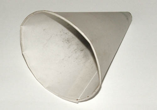 Papieren kruittrechter Heeft Hildo gekregen van een benzinepomp. Daar worden ze gebruikt om olie in een motor te gieten. Hildo giet het kruit dat nog in zijn kruitmolen zit na gebruik via deze trechter terug in de bus met zwartkruit. Geen geknoei, geen kans op statische vonken, is gratis en werkt perfect!