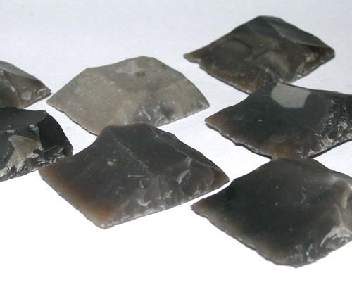 Vuurstenen U kunt beter niet met vuursteenwapens gaan schieten als u geen reserve vuurstenen bij de hand hebt. Op de foto ziet u verschillende, en ze zien er allemaal anders uit. Zo is dat nu eenmaal met vuurstenen. Het geeft verder niet zolang de lengte maar ongeveer goed is voor uw wapen en er een mooie scherpe rand aan zit. Naarmate u vaker met uw steen geschoten heeft brokkelt hij steeds verder af. Als hij uiteindelijk niet meer scherp is dan kunt u mooie vonken wel vergeten en dient u van vuursteen te verwisselen of uw stompe steen weer aan te scherpen door middel van tikjes uitdelen met een stukje ijzeren gereedschap. Dat heeft Hildo al een keer geprobeerd waarbij de steen pardoes afbrak. Vuurstenen zijn er in alles soorten en maten, waarbij Engelse vuurstenen tot de top schijnen te behoren. Er zijn machinaal bewerkte, maar met de hand geslagen stenen schijnen de beste te zijn. Het vuurstenen slaan is een hele wetenschap met allerlei filosofieën. Hildo heeft er nog niet zoveel verstand van, maar dat komt misschien nog wel en kan hij proberen zijn eigen perfecte vuurstenen te slaan.