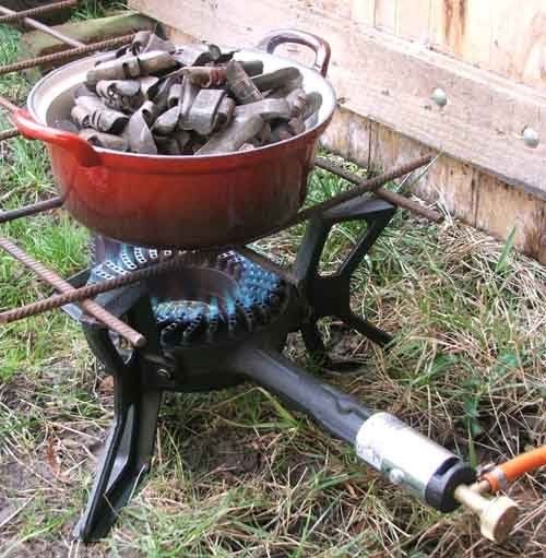 Gasbrander Kleine branders is niks, power moet u hebben! Dit is goed voor de soeppan van een picknickend weeshuis of voor een grote pot met lood. In combinatie met een gietijzeren pan de perfecte oplossing om gebruikt en smerig lood om te vormen tot frisse schone loodbaartjes. De loodbaartjes, eventueel in verschillende legeringen voor de verschillende applicaties, kunt u merken en sorteren. En u kunt de baartjes zó in uw smeltoven gooien zonder dat de pot vervuild raakt.