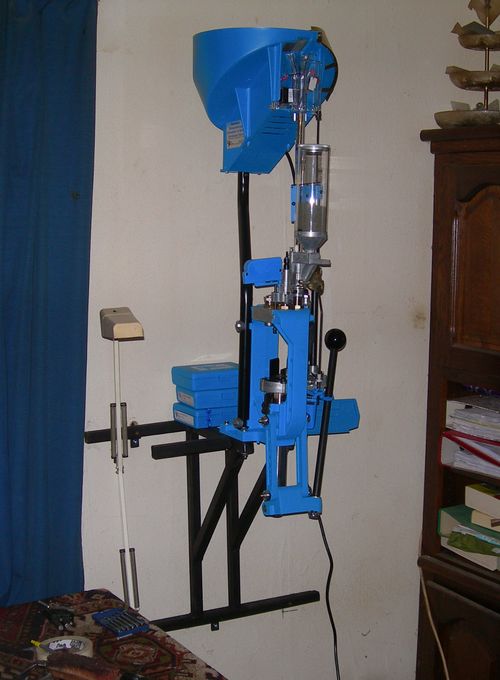 Dillon XL 650 progressieve herlaadpers Zelf herladen is goedkoper en als u patronen in elkaar aan het zetten bent op een single stage pers, zoals de Rock Chucker die Hildo heeft, dan gaat daar nogal wat tijd inzitten. Iets van dik 100 patronen per uur is goed haalbaar als u het niet voor de eerste keer doet. Als u veel schiet bent u op een gegeven moment om de haverklap aan het herladen in uw kostbare vrije tijd. Dan is een progressieve pers als deze een uitkomst. Het is een soort munitiefabriekje waarmee u, als u vlot doorwerkt en er geen storingen zijn, in theorie tot 1000 patronen per uur kunt maken... niet dat Hildo dat haalt maar 400 per uur wel, incl. alle tussentijdse werkzaamheden als kruitbijvullen, hulzen invetten en vullen, nieuwe kogels halen en slaghoedjes prikken. U hoeft in principe alleen nog maar een kogel op de huls te zetten... en zelfs dát kan automatisch mocht u dat willen. Een geweldig apparaat wat tientallen jaren mee kan, maar wel een fikse investering is in de schietsport. Alleen aan te raden als u veel herlaadt, te weinig tijd hebt, of zoals Hildo, herladen geen bijzonder leuke bezigheid vindt. Bij elke slag van het handvat is er alweer een nieuwe patroon, alleen dát maakt het herladen al leuker, en het is een serieuze snelheidswinst!