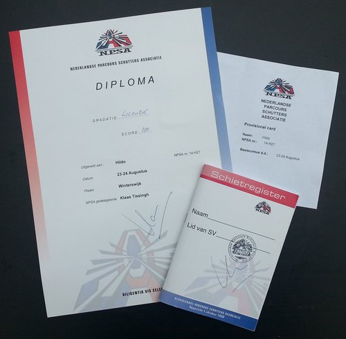 NPSA diploma Handgun Verplicht om te halen als u lid wilt worden van de NPSA (Nederlandse Parcours Schutters Associatie) om IPSC (International Practical Shooting Confederation) wedstrijden te schieten. Bij deze wedstrijden dient u zich met uw doorgeladen pistool te verplaatsen in een zo hoog mogelijk tempo. Om de veiligheid ten alle tijde te kunnen waarborgen is, ondermeer, een diploma noodzakelijk. Hildo is geslaagd!