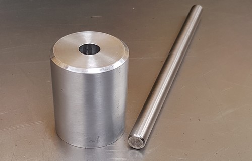Hulsmal en Hulsstaaf voor Juliette de Chassepot Dit is om originele stijl papierpatronen voor een Chassepot naaldvuurgeweer zelf te kunnen maken. Een aluminium hulsmal van 13.4mm binnendiameter, de originele buitenmaat van de patroon, en een RVS hulsstaaf van 12.4mm buitendiameter. Hildo hoopt dat dit in de praktijk gaat werken.