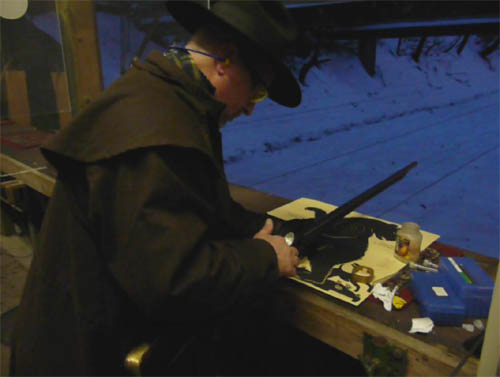23 april 2010. Schieten met de Navy (2) Het is donker op het schietpunt en Hildo ziet één van de zes kruitbuisjes, hij legt er altijd zes klaar, over het hoofd. Daar komt hij pas achter als hij de kogel in de kamer geperst heeft, met vetpil maar... zonder kruit. Het zit niet mee vandaag.