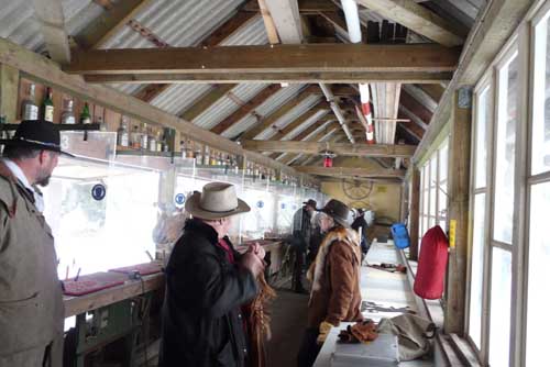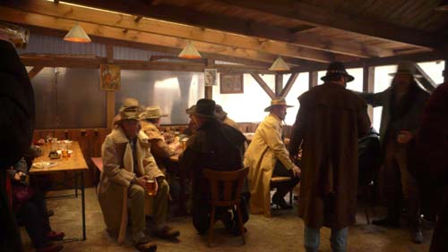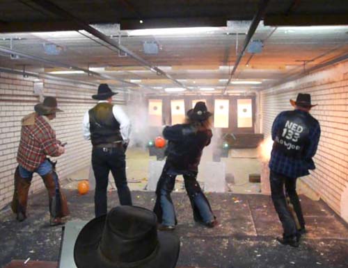 Kantine Belangrijk hoor, een kantine. Tussen het schieten door is het er prima toeven aan de bar van de Schuttershof. Zelfs een keuken is van de partij. Behalve koffie en bier was er zelfs zelfgemaakte dropshot. Het glaasje dat Hildo, na het schieten, naar binnen goot smaakte bijzonder goed. Een uitstekend eigen brouwsel van één der Scherpschutters met als hoofdingrediënten Duitse drop en een grote hoeveelheid wodka. Proost! Zwartkruitgehalte Dat lijkt niet bijzonder groot te zijn binnen deze club, tenminste dat idee kreeg Hildo, maar hij kan er best naast zitten want er wordt toch maar even een westerndag georganiseerd. Het viel hem op dat meer dan een paar leden geen cowboyhoed dragen, en zonder valt u als cowboy gelijk door de mand. De aanwezige leden van o.a. The Poachers, de DFDA en verscheidene Duitse cowboys maken dat weer helemaal goed.
