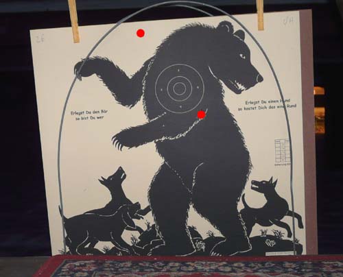 Meten is weten De BFR schiet hoog en het gaat niet helemaal lekker. Hoe hoog dan? Hildo meet met zijn handen hoever de kogel hoger zit dan het richtpunt en komt op ongeveer iets minder dan 1/2 gedeelte van de kaart uit. Dat betekent dat wanneer u in het midden van de kaart wilt schieten, u aan de onderkant van de kaart moet richten, misschien nog iets daar beneden. Gereduceerde ladingen komen hoger in de kaart uit en het verstelbare vizier is niet verder naar beneden te draaien. Daarmee wordt het precisie schieten een beetje een gevoelskwestie, dat ligt Hildo prima want hij is een hartstikke gevoelig tiepje.
