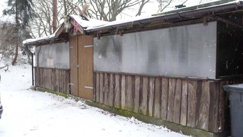 Winter clubhuis Waar de veranda normalerwijze een uitzicht biedt is nu gebruik gemaakt van isolerende lichtdoorlatende kunststof beplating om de kou min of meer buiten te houden. Superwarm is het niet, maar het heteluchtkanon bijgestaan door een elektrische kachel houdt het binnen aangenaam.