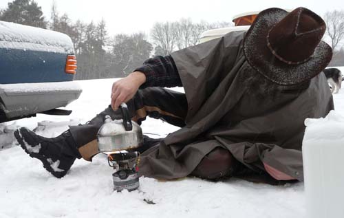 Benzinebrander Een benzinebrander is een noodzaak voor dit soort weersomstandigheden, dat weet Hildo omdat het niet de eerste keer is dat hij in een frisse omgeving een vuurtje aansteekt. Het duurt even voor een benzinebrandertje op temperatuur komt en goed brandt. Een brandertje op gas is handiger, maar branden doen ze niet goed meer als het koud wordt, de druk valt weg uit het gasbusje en ermee kokkerellen kunt u uiteindelijk wel vergeten. Deze Coleman 442 Feather is met 75 euro zo ongeveer de goedkoopste benzinebrander en hij doet het hopelijk beter dan Hildo's 20 jaar oude, net weggegooide, Coleman Peak 1, die tot twee maal toe ernstig last had van een afgebroken naald. Zijn eeuwig verstoppende Zweedse Primus Hunter waar geen pompje op zat om hem op druk te brengen, was ook geen succes. Deze nieuwe Coleman Feather 440 uitvoering heeft geen naald meer om de sproeier schoon te maken, en daarmee ook geen fijnafstelling meer. De 'sudderstand' is niet meer realiseerbaar. Te laag en het ding gaat gewoon uit, de laagste stand is veel te hoog. Als u van aangebrande tosti's en eieren houdt is dit een prima brander. Makkelijk de sproeier doorprikken zit er ook niet in vanwege de constructie van dit type Coleman branders, maar goed... het is een budget benzinebrander, dat mag u niet vergeten. Er wordt vanaf nu alleen nog maar op wasbenzine gekookt in plaats van op loodvrije autobenzine om eventuele problemen zo lang mogelijk uit te stellen want met schonere brandstof gaat het vast langer goed. Maar, Hildo is er van overtuigd, ze blijven evenwel toch onbetrouwbaarder dan een veel goedkoper gasbrandertje. Zolang u niet te ver van huis gaat, en daarmee de verkrijgbaarheid van gasbusjes niet in het gedrang komt én u niet in koude omstandigheden wilt koken, blijft een gasbrander favoriet.