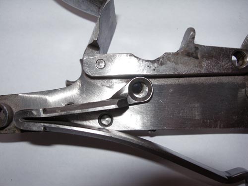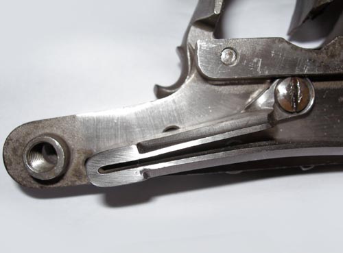 2) Hoofdveer past niet Behalve over de kwaliteit van de Pedersoli hoofdveren, heeft Hildo ook zijn bedenkingen over de precisie. U ziet, het ronde gat van de veer zit lang niet goed voor het boutgat waarmee de veer vastgezet wordt. Het is geen exemplarisch probleem, de Pedersoli veren zijn allemaal gelijk en passen nooit... in ieder geval niet op deze (Pedersoli) musket..