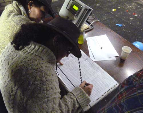 Puntentelling Duel In het begin zitten er nog twee heren die de puntentelling verzorgen, maar dat leek niet geheel goed te gaan. Snel werd er een beroep gedaan op de dames met ervaring, en daarmee waren de administratieve problemen snel opgelost. Het valt echt niet mee hoor, want Hildo keek even mee over de schouders van de dames maar ook hij snapt er weinig van, mannen zijn te dom. Iedere schutter schiet precies éénmaal tegen elke andere schutter en het is best lastig om de scores op papier bij te houden, dus hoera voor deze dames die het Europese Kampioenschap wisten te redden.